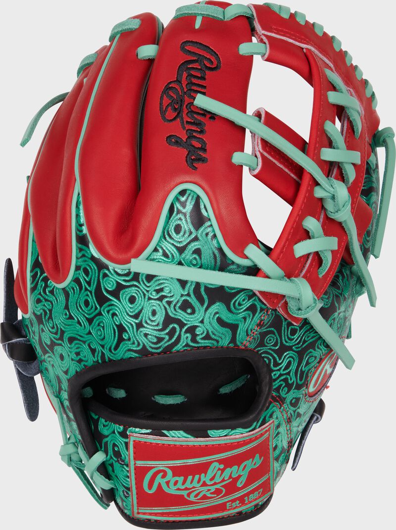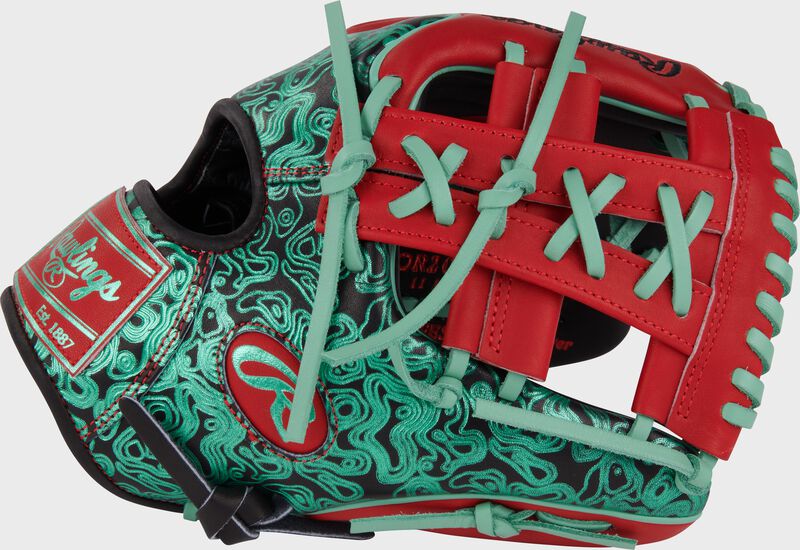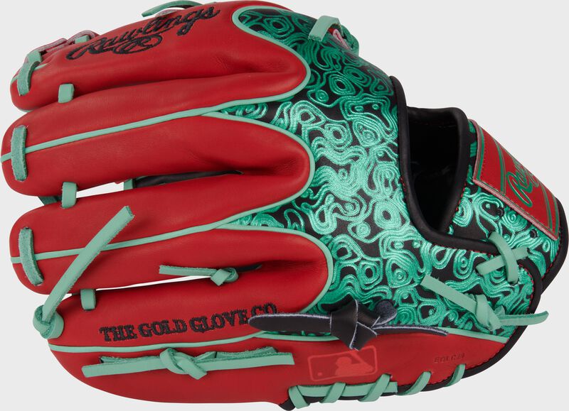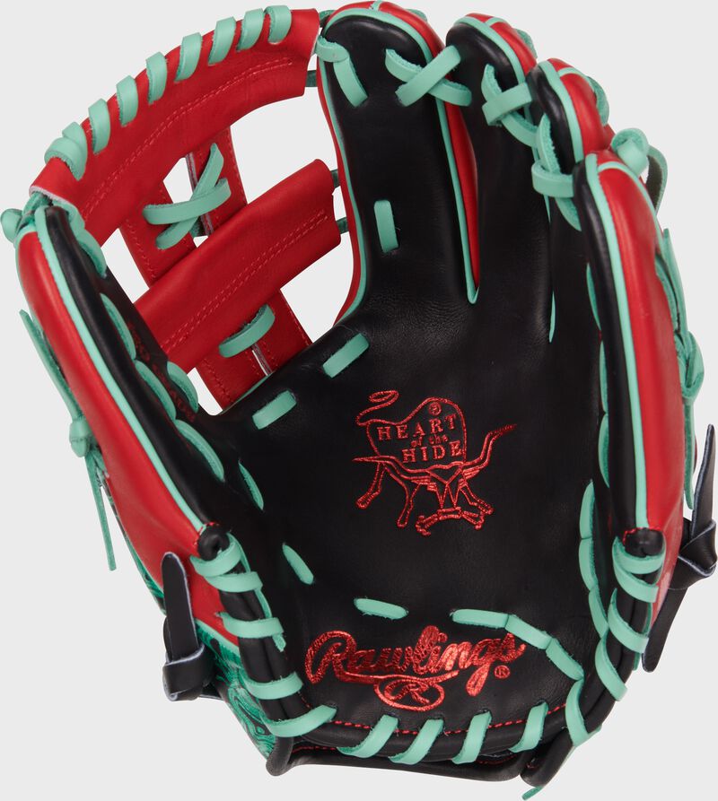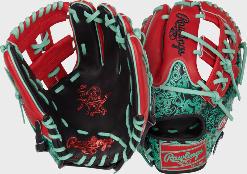 This 11.5-inch Rawlings Heart of the Hide Colorsync infield glove is a must-have for elite infielders and glove collectors alike. Right off the bat you will notice this gloves stunning mint geoprint pattern on top of its black leather. Additionally, this glove includes many red accents that pairs well with its red leather trim. To top it off, we slapped on a unique leather, red and mint Rawlings patch that will have you glowing on the field.