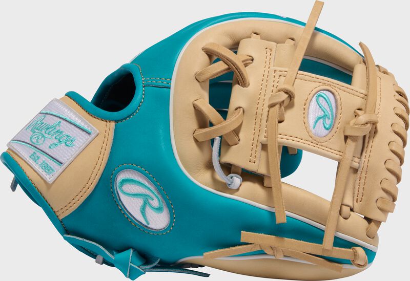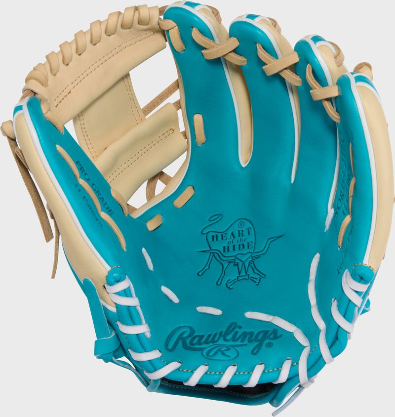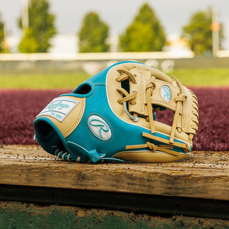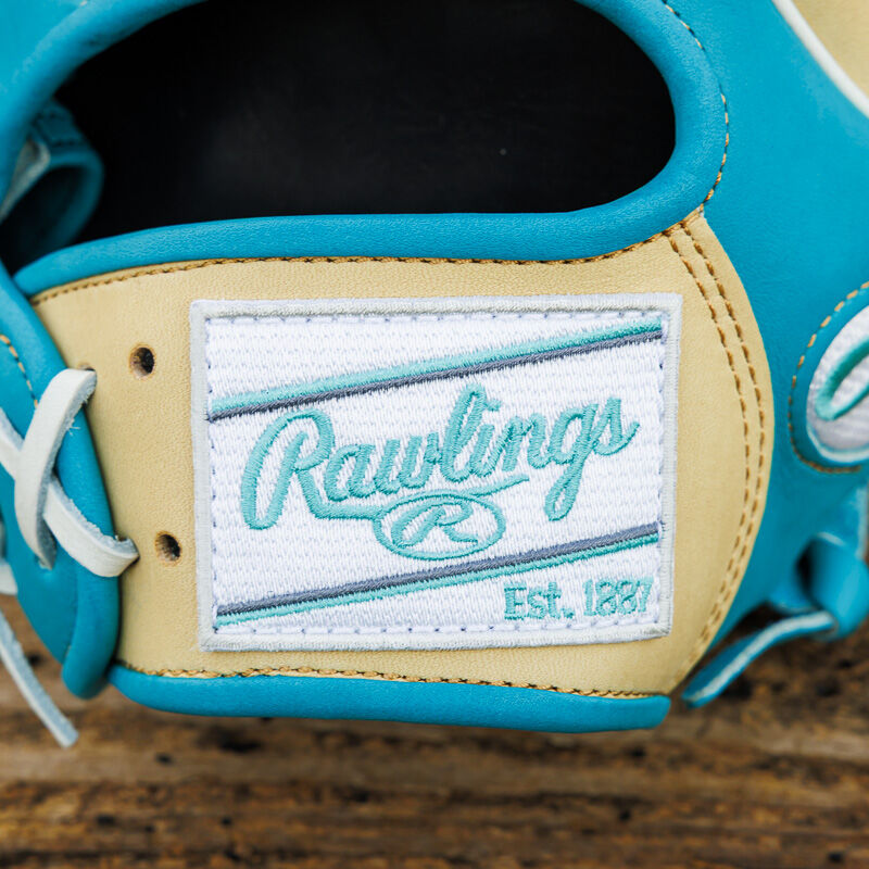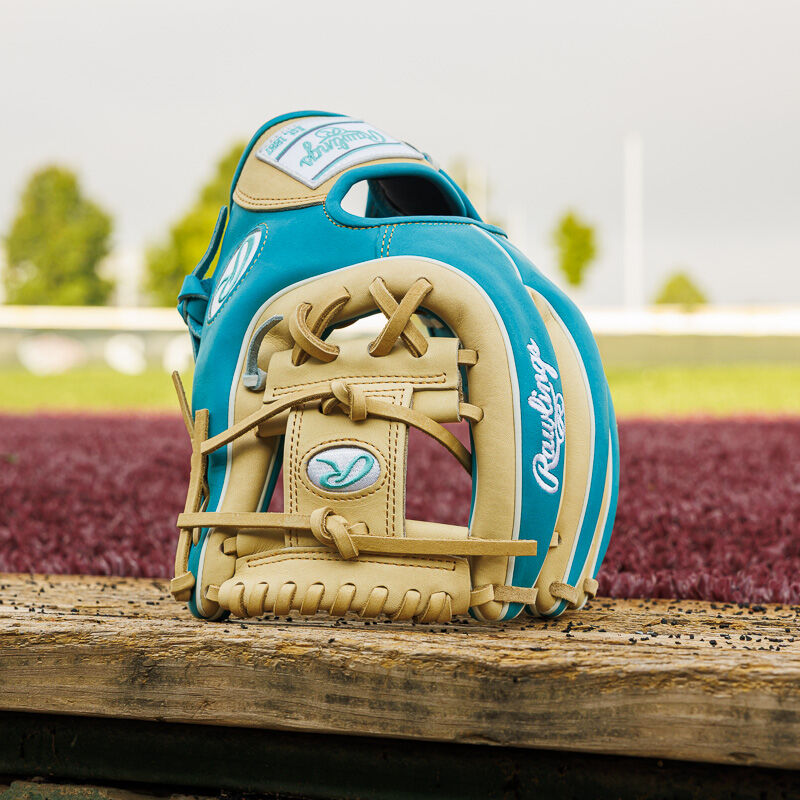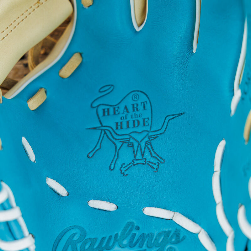 Show off this stunning Rawlings 11.5-inch Heart of the Hide infield glove that features a beautiful camel and teal colorway.. Not to mention the unity it has with the white/teal Rawlings patch!