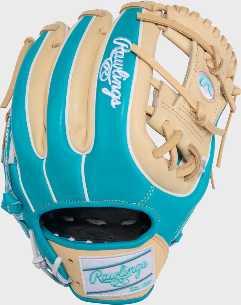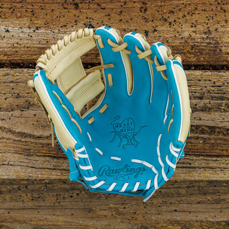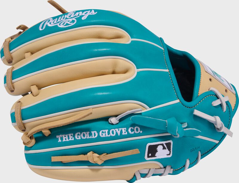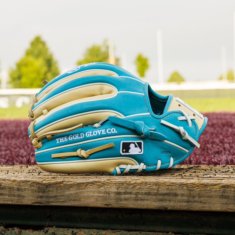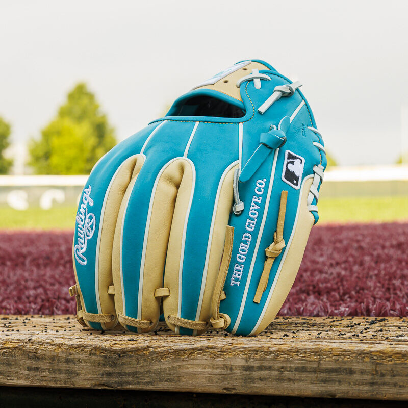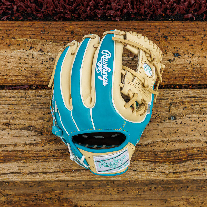 Show off this stunning Rawlings 11.5-inch Heart of the Hide infield glove that features a beautiful camel and teal colorway.. Not to mention the unity it has with the white/teal Rawlings patch!