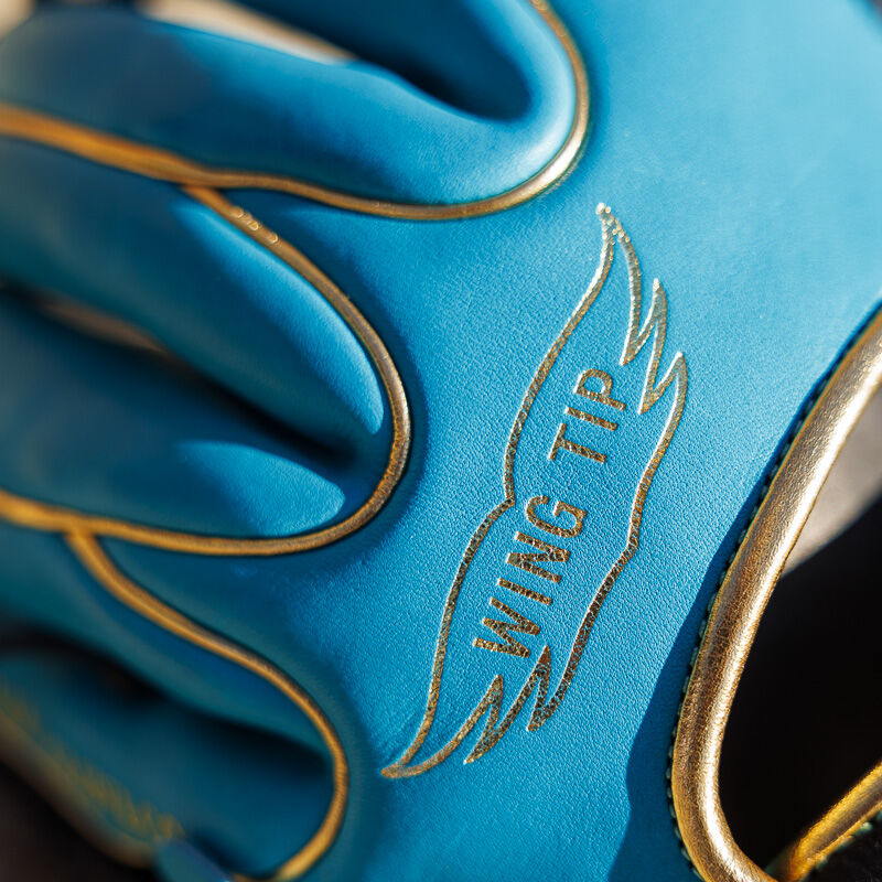 Right off the bat, you will notice this gloves eye-catching colorway that will turn heads as soon as you step onto the field. This vibrant colorway is accented by dazzling gold, foil palm stamp.