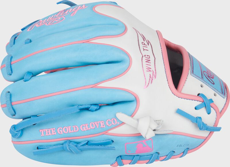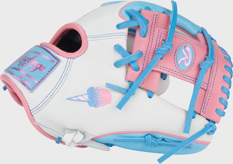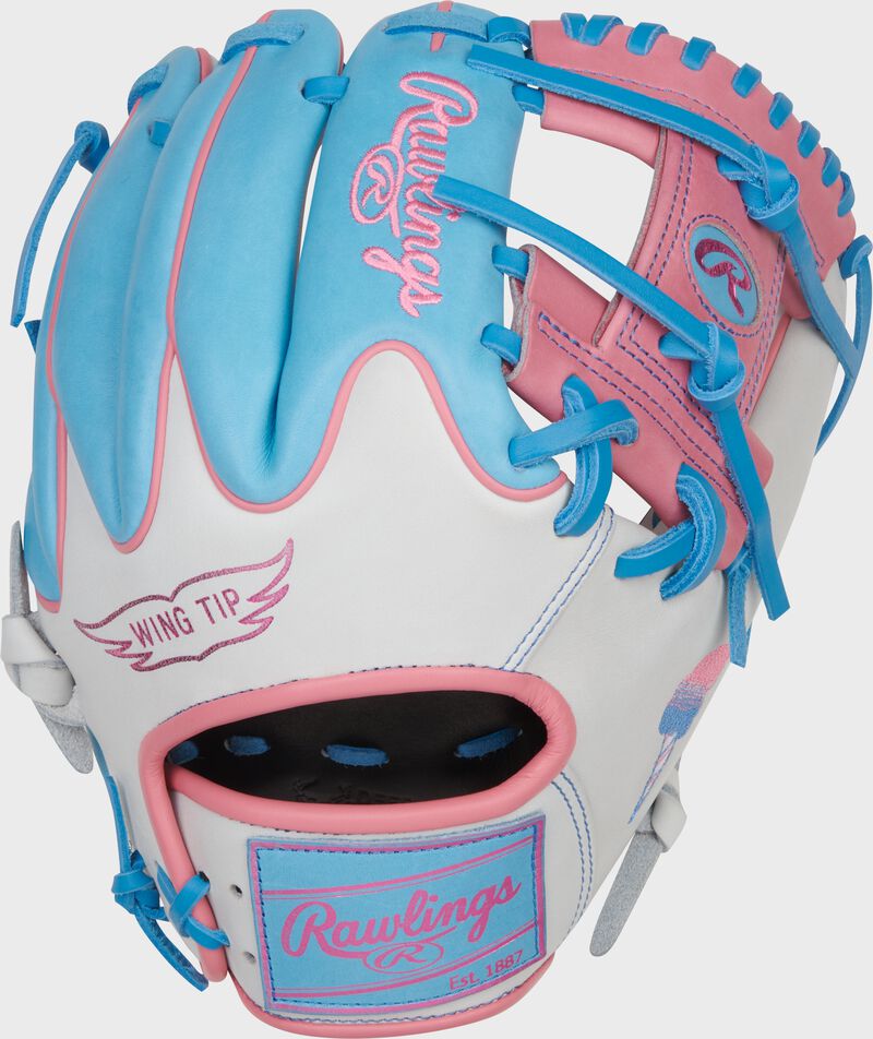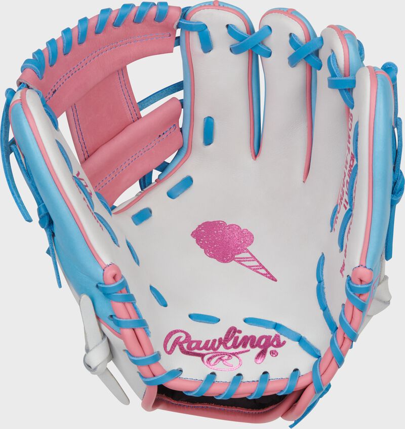 Featuring a bright white/Columbia blue Wing Tip shell, this glove is as eye-catching as it is high performing. The pink, Columbia blue and white colors perfectly resemble the famous treat to help you make sweet plays look even sweeter! Complete with a stylish cotton candy embroidered on the thumb and palm stamp, this glove is the perfect blend of seasonal cheer and legendary craftsmanship. Plus, each one of these 288 gloves is individually numbered, so yours will be truly one of a kind.